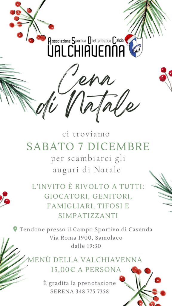 L’Associazione Sportiva Dilettantistica Calcio Valchiavenna invita tutti i suoi giocatori, genitori, famigliari, tifosi e simpatizzanti a celebrare insieme il Natale con una serata speciale.